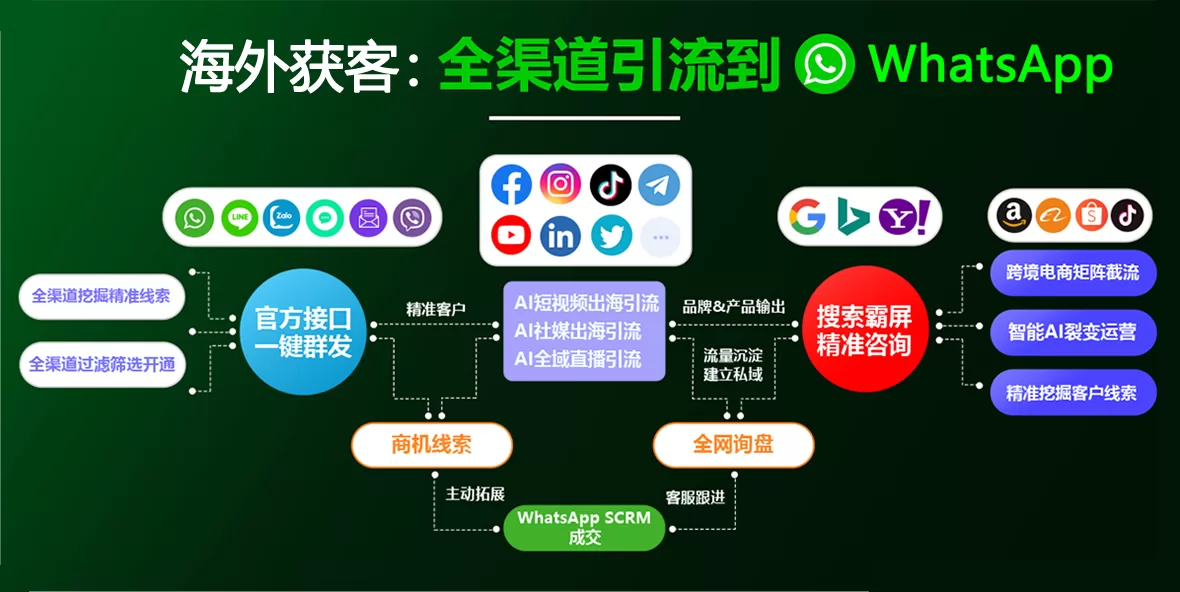 私域神器通过多元化的营销渠道,帮助企业在全球范围内实现高效客户获取。以下是我们的主要获客渠道: