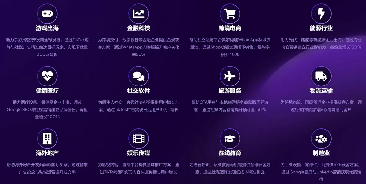 为语言培训、职业教育等机构提供全球获客方案,通过社媒矩阵实现低成本精准引流